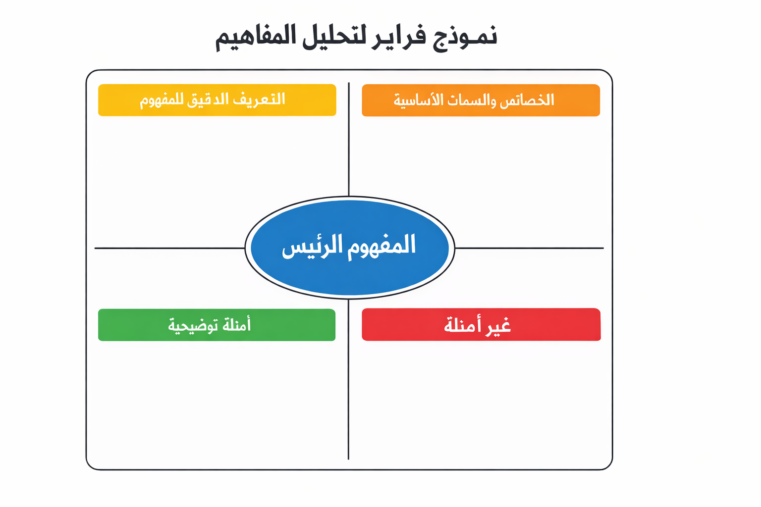 يُعدّ نموذج فراير من الأساليب التعليمية الفعّالة التي تساعد على فهم المفاهيم وتحليلها بطريقة منظمة وواضحة، حيث يقوم على تقسيم الفكرة إلى تعريفها وخصائصها وأمثلتها وغير أمثلتها. ويُستخدم النموذج الفارغ كقالب جاهز يمكّن المعلمين والطلاب من تعبئته بسهولة لتنمية مهارات التفكير والاستيعاب العميق للمفاهيم المختلفة.